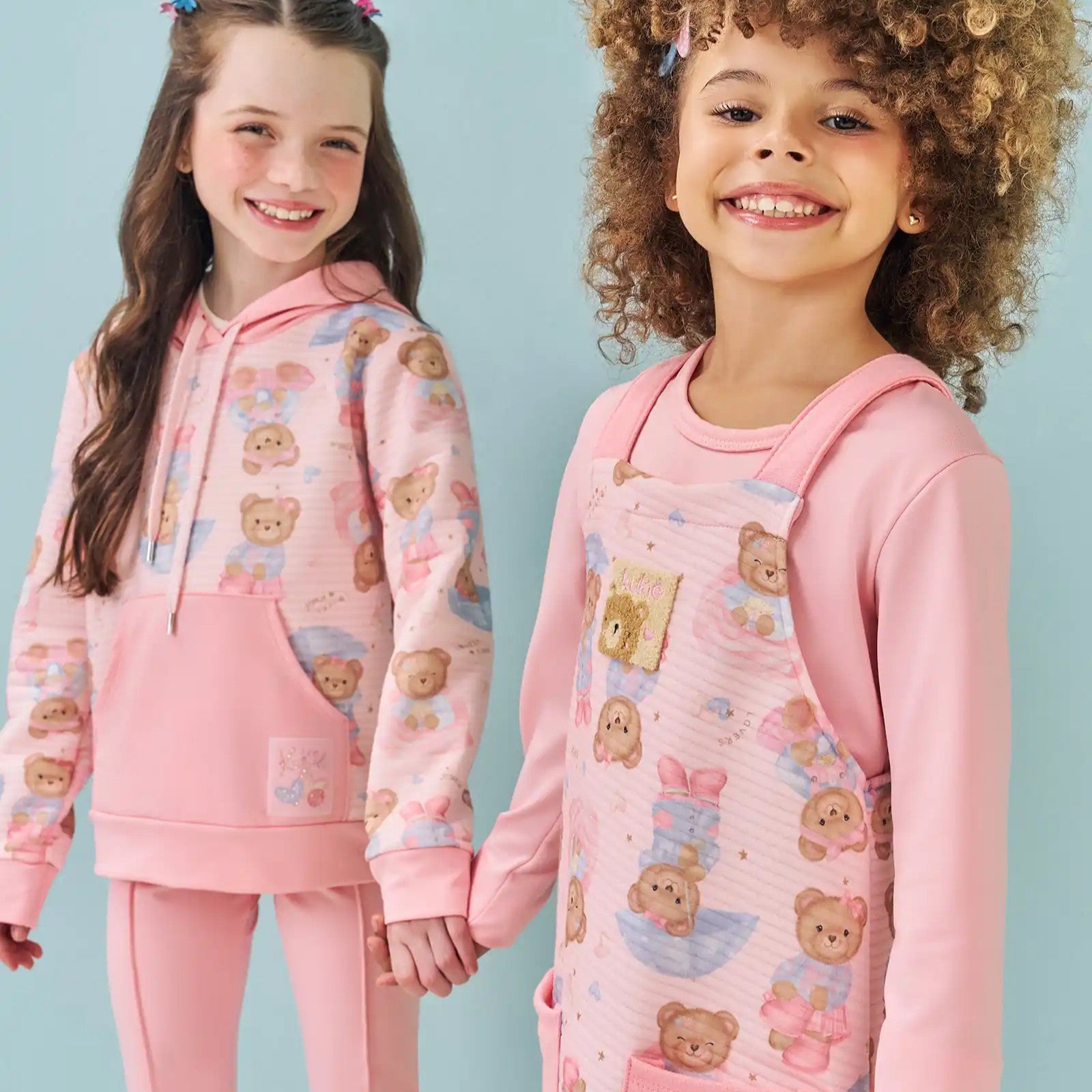 O conjunto infantil da Kukiê é composto por um moletom com capuz e calça legging, ambos confeccionados em tecido macio e confortável, ideal para os dias mais fresquinhos. O moletom apresenta estampa divertida e delicada de ursinhos em tons suaves, com bolso canguru funcional e acabamento canelado nas mangas, proporcionando um toque lúdico e acolhedor ao visual. A calça possui modelagem ajustada, garantindo liberdade de movimento e conforto durante todo o dia. Perfeito para momentos de lazer, passeios em família ou até mesmo para um look estiloso no dia a dia, esse conjunto une praticidade, charme e qualidade para deixar as pequenas ainda mais encantadoras.