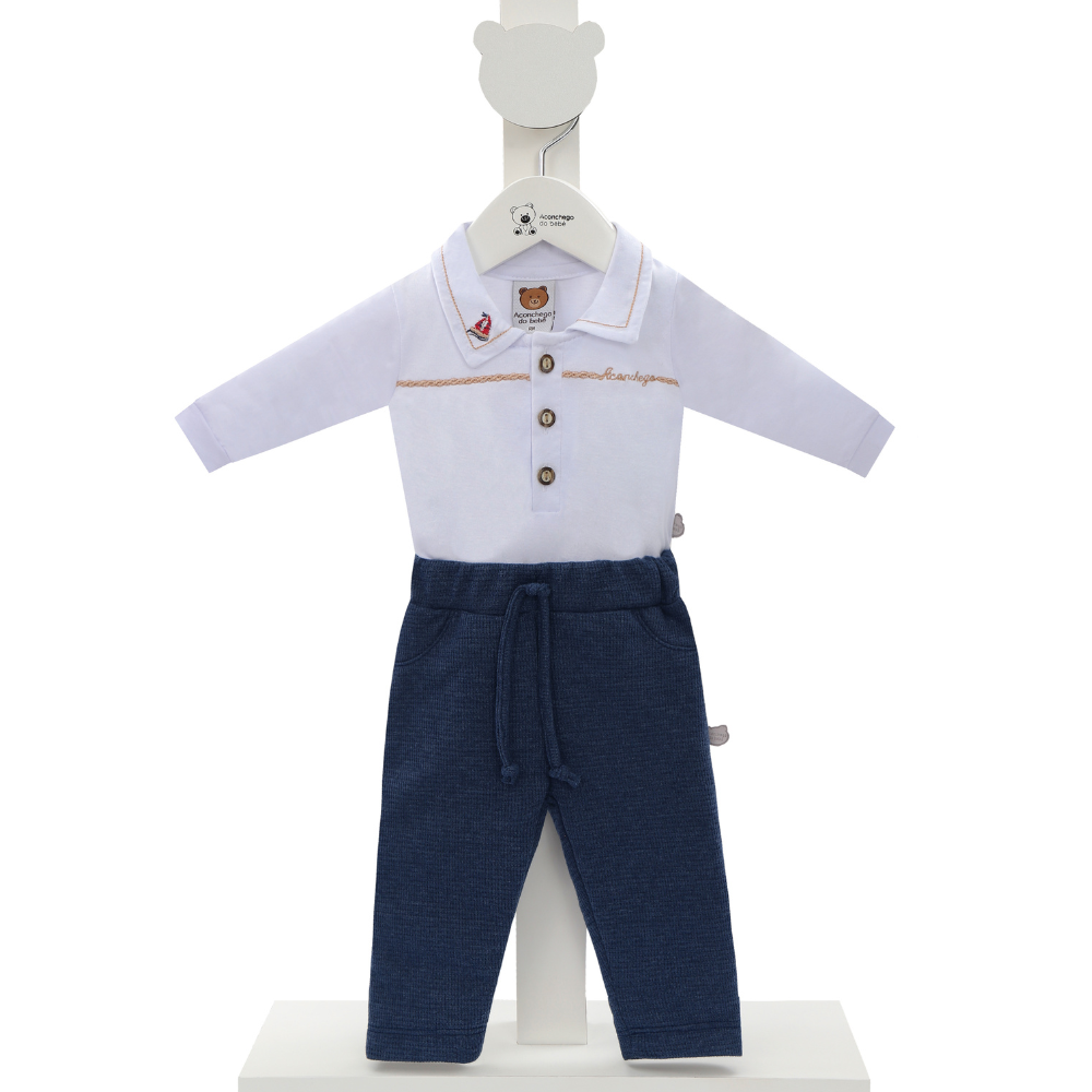 A parte de cima é um body manga longa em malha macia e respirável, na cor branca clássica. O destaque fica por conta da delicada gola polo, adornada com um sutil bordado que adiciona um toque de sofisticação. Os detalhes de botões na vista e o bordado exclusivo com a temática de ursinho e uma borboleta dão um charme único e autêntico à peça. A praticidade dos botões de pressão entre as perninhas facilita a troca de fraldas, pensando sempre no bem-estar do seu bebê.