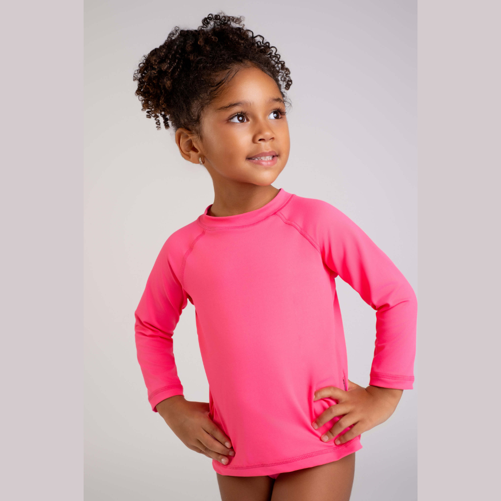 Camiseta com fator de proteção solar 50+ infantil, manga longa, para crianças de até 3 anos curtirem o verão com estilo e protegidas dos raios solares. É feita em fluity, um tecido leve e confortável para o verão.