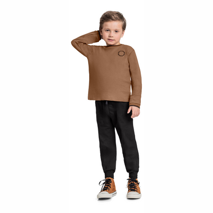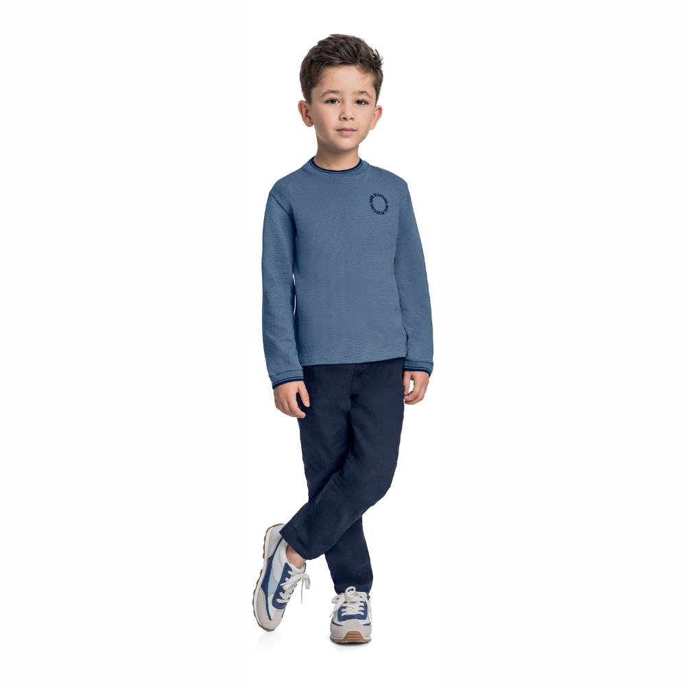 Blusa infantil masculina de manga longa, disponível nas cores azul e caramelo, com textura canelada e detalhe bordado no peito. Ideal para compor looks confortáveis e estilosos nos dias mais fresquinhos, a peça une praticidade e charme para o dia a dia dos pequenos. Perfeita para passeios, escola ou momentos de lazer com a família.
