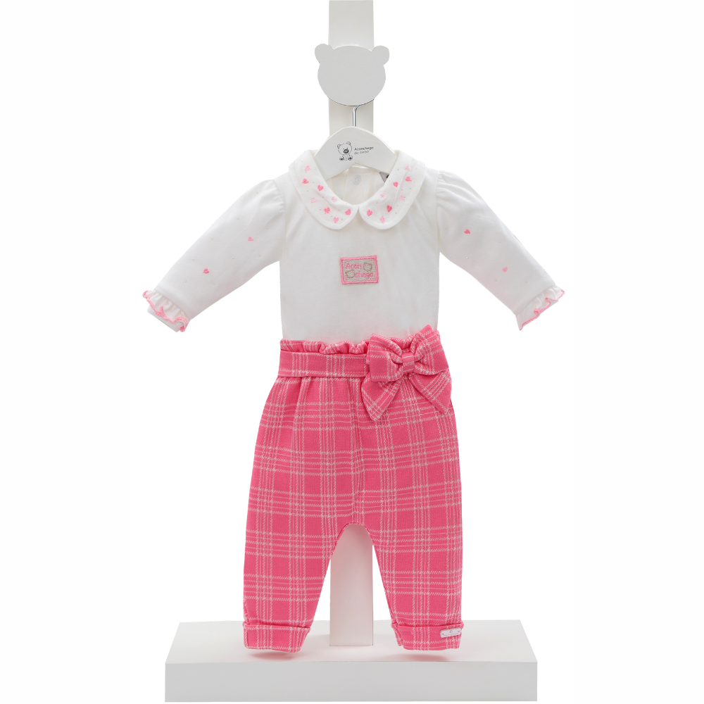 Conjunto infantil feminino com 2 peças: body branco de manga longa com estampa de corações e gola delicadamente bordada, acompanhado de calça rosa xadrez com cós franzido e laço decorativo. Ideal para ocasiões especiais como passeios, festas ou ensaios fotográficos, o look combina fofura e conforto para deixar as pequenas ainda mais encantadoras.