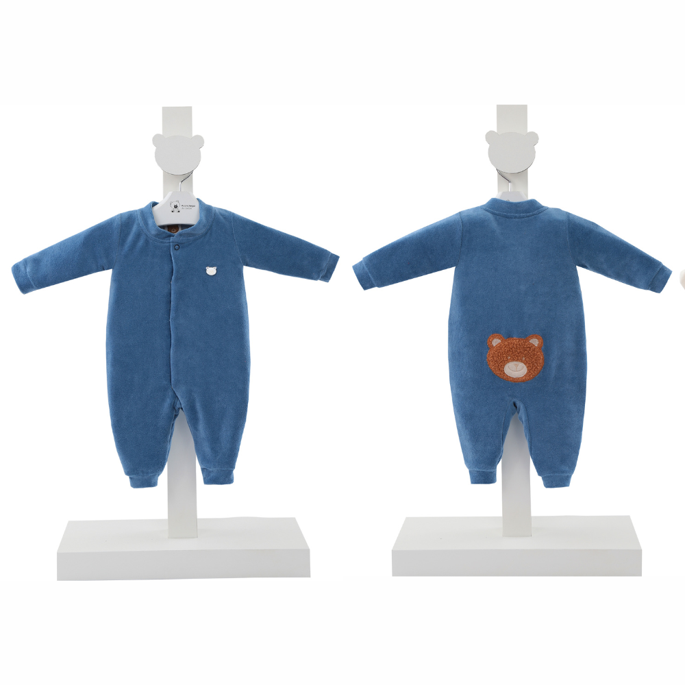 Macacão longo infantil masculino em plush azul: com abertura frontal por botões de pressão e detalhe bordado de ursinho no peito e nas costas, a peça une praticidade e um toque lúdico que encanta. Ideal para o dia a dia, passeios ou momentos especiais, garante conforto e muito charme para os pequenos.