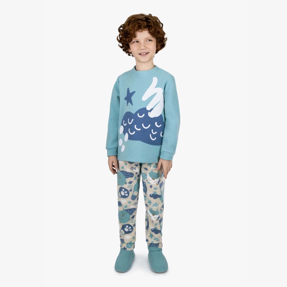Pijama infantil para menino. Feito em soft, um tecido macio e resistente que não desfia nem cria bolinhas. Perfeito para manter os pequenos aquecidos e confortáveis durante a noite ou em passeios. A estampa de balões na blusa brilha no escuro, adicionando um toque encantador e divertido!