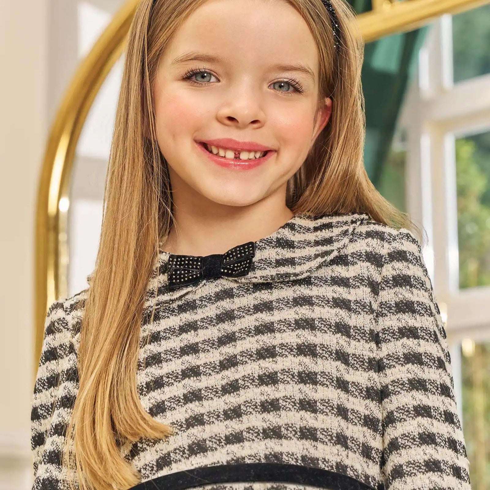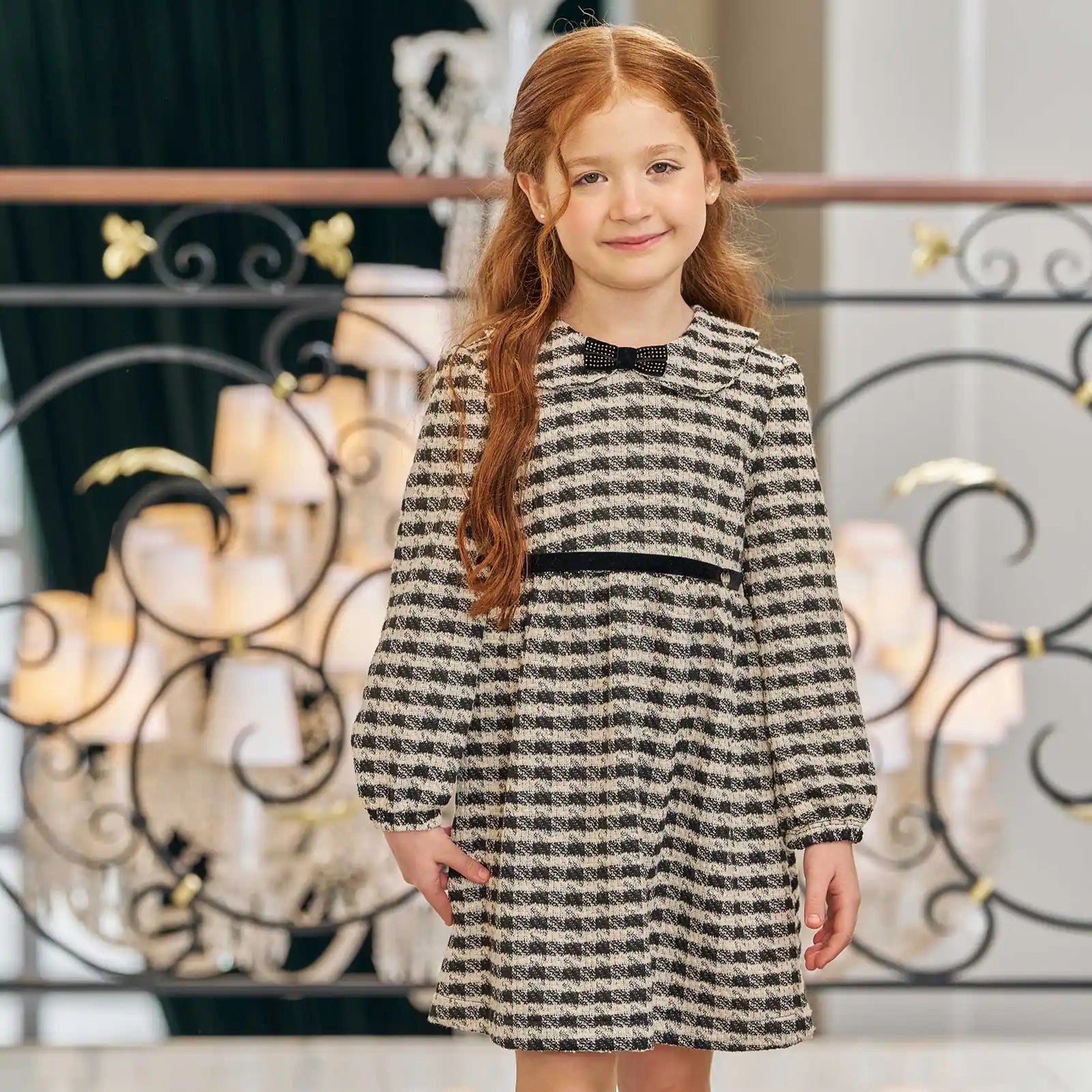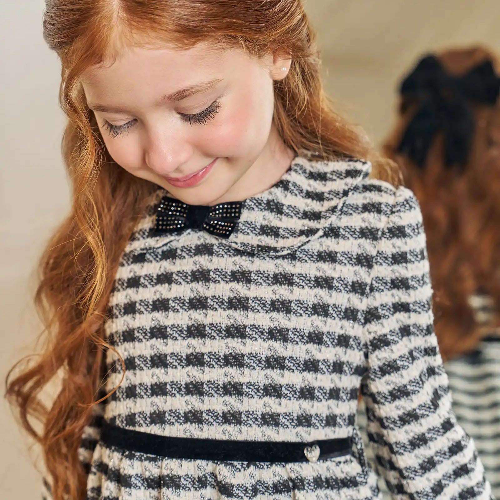 Confeccionado em malha tweed de alta qualidade, o vestido oferece uma textura única e elegante, além de ser extremamente confortável. O destaque fica por conta da gola em formato Peter Pan, um detalhe atemporal que agrega um toque vintage e gracioso ao vestido, além disso o laço de strass aplicado na gola traz brilho e sofisticação ao look. Seja para uma festa de aniversário, uma cerimônia ou um evento especial, o vestido infantil em malha tweed é a escolha perfeita para ocasiões que pedem elegância. Para um look com personalidade e estilo combine o vestido com meias básicas e um mocassin.